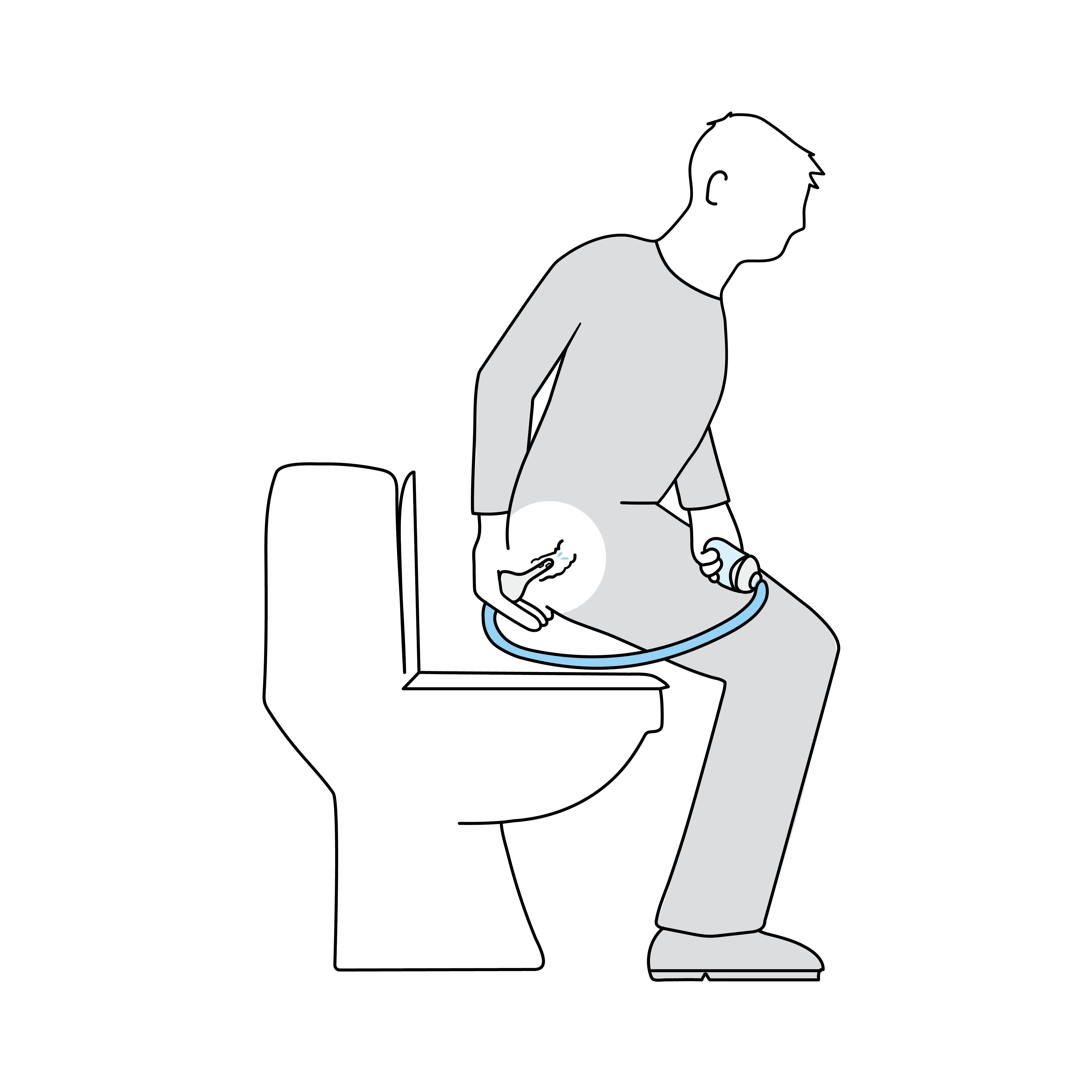Tip: Billedet viser indføring af konus bagfra ved at strække hånden bagom for at føre den ind i endetarmen. Hvis det føles mere komfortabelt, kan du eventuelt indføre konus forfra ved at føre den bagud mellem dine ben og derefter ind i endetarmen.