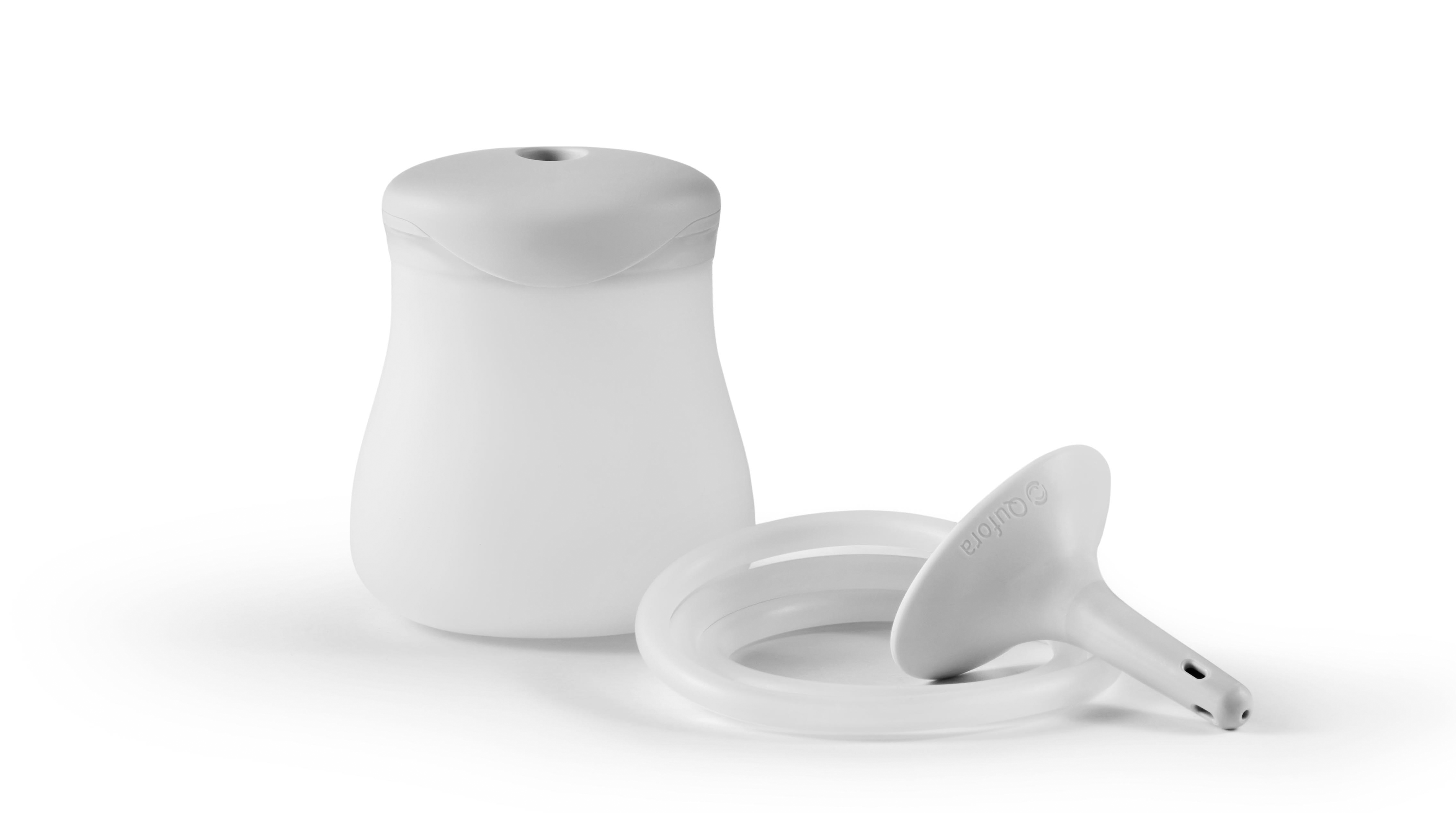 Tryk enden af konus flex godt fast i den lille runde åbning på låget. For at aktivere den glatte overflade (hydrofilbelægning), skal du fugte hele konus med vand op til dens base i et par sekunder. Klem forsigtigt på pumpen, indtil der kommer vand ud af konus. Den er nu klar til brug.